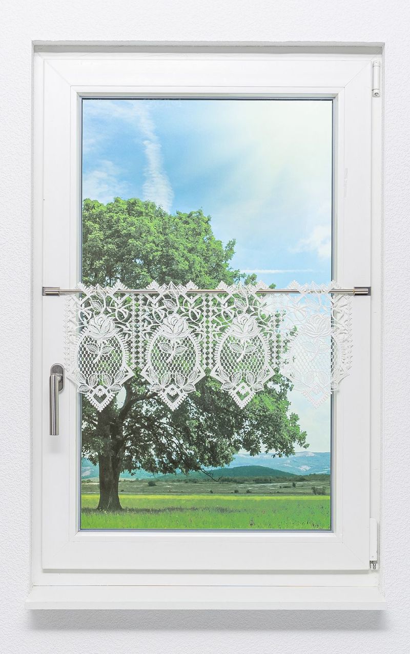 Diese Scheibengardine scheint nur aus geschwungenen, in überwiegend gleichmäßigen Abständen angeordneten feinen Kordeln zu bestehen. Daran haben sich kreisförmige Elemente angeheftet, die zwar gleich groß, aber mit zwei unterschiedlichen Mustern ausgefüllt sind. Diese Formen sind dicht und symmetrisch nebeneinander angeordnet und am unteren Abschluss zuhauf zu finden. Die luftigen Kordelstränge und die filigranen Formen lassen eine Fensterdeko entstehen, die sich charmant und zart über die Glasscheibe legt. Der Lichteinfall bleibt dadurch unverändert, dieses Modell erfüllt ausschließlich ästhetische Zwecke, macht am Fenster von Küche und Esszimmer eine besonders gute Figur. Die Aussparungen für den Stangendurchzug sind in das Muster integriert; damit lässt sich die Bistrogardine einfach auf eine Scheibengardinenstange, etwa eine Klemmstange, Pinnstange oder Vitragestange, auffädeln.