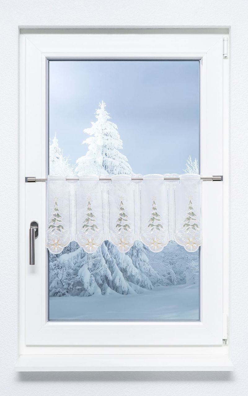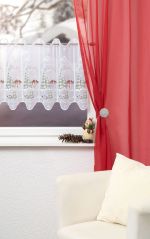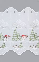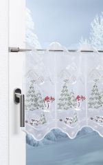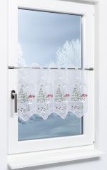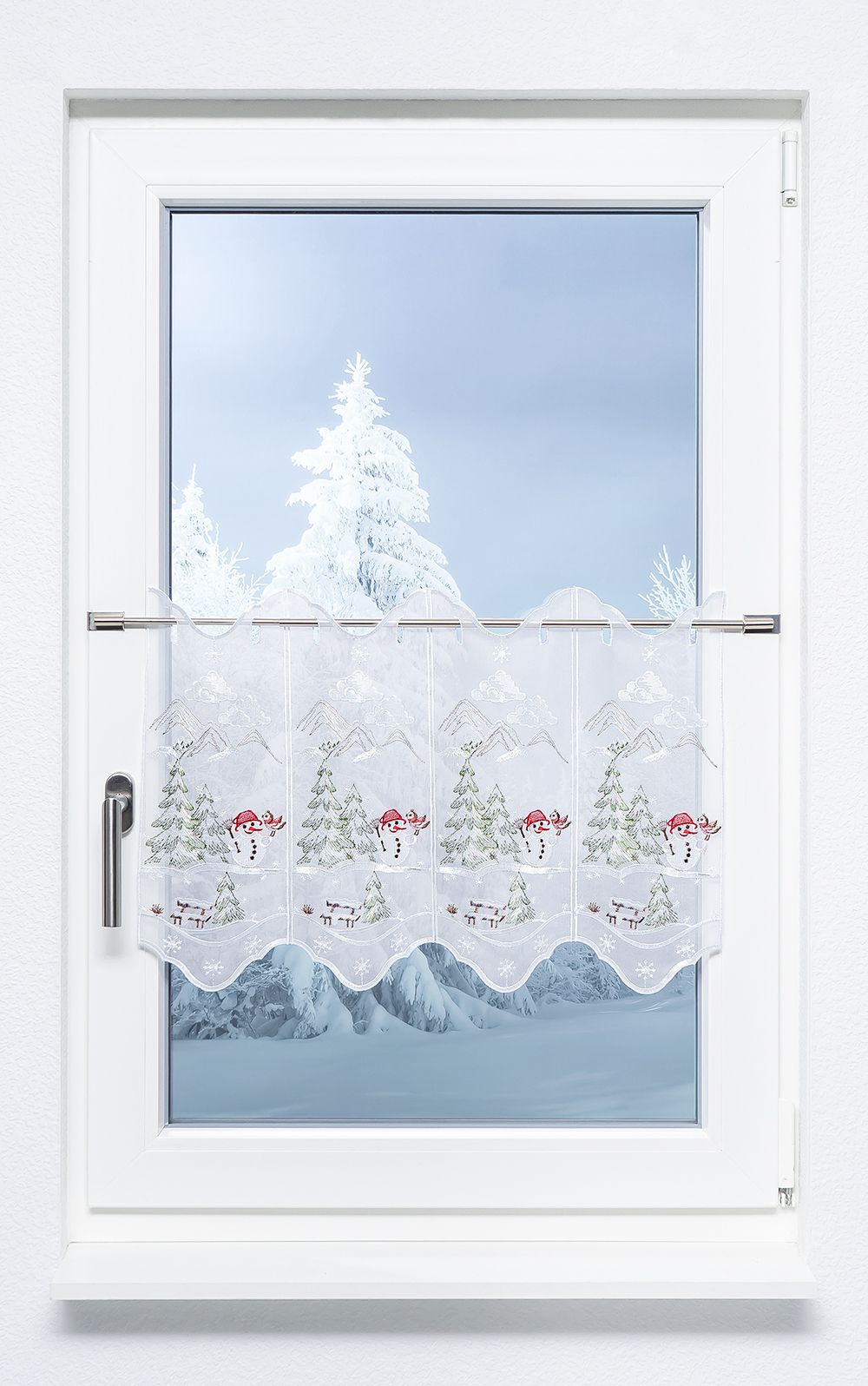 Mit der feinen Stickerei erinnert diese Scheibengardine an eine verschneite Winterlandschaft. Die Berge im Hintergrund sehen ebenso wie die schneebedeckten Fichten oder Tannen nahe beim Schneemann wie verzaubert aus. Mit dem kleinen, fröhlichen Schneemann ist die Stickerei aus Plauener Spitze® vollkommen und lädt zu einem schönen Spaziergang im Freien ein. Die halbtransparente Spitzengardine ist in verschiedenen Breiten in Rapportschritten von 16,2 cm erhältlich. Die Aufhängung erfolgt mittels Stabdurchzug.