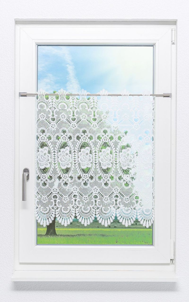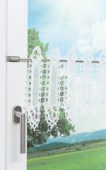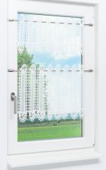 Diese filigran gearbeitete Scheibengardine verbindet verschiedene Elemente und Muster zu einem harmonischen Ganzen. Längs verlaufen Streifen auf durchsichtigem Stoff, die seitlich mit Spitzenbögen geschmückt sind. Es entsteht ein Design, das den Wechsel aus transparenten Stoffbahnen und grobmaschigem Spitzengeflecht zeigt. Der obere und der untere Abschluss sind mit hübschen Rosenblättern und Blumenornamenten gestaltet. Das lockere, transparente Polyestergewebe trägt zu einer lichtdurchfluteten Atmosphäre bei, die Bistrogardine erfüllt vornehmlich dekorative Zwecke. Der Stangendurchzug am oberen Abschluss fügt sich hier bemerkenswert harmonisch in das Muster ein. Dieses Modell ist in verschiedenen Höhen und Breiten erhältlich und lässt sich schonend bei 30 Grad in der Maschine waschen. Spannvitragen, Klemm- und Pinnstangen finden Sie ebenso wie Klebehaken und Klemmträger hier im Shop.