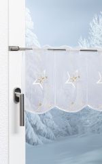 Auf dem weißen Stoff der Scheibengardine sind die goldfarbenen Verzierungen glanzvolle Highlights. Lediglich die klassischen Sterne als Umrahmung sind in Weiß gestaltet. Freundlich und hell präsentiert sich diese Scheibengardine für Weihnachten am Fenster, lässt sich wunderbar mit Deko-Elementen in Gold sowie den typischen Farben Grün und Rot kombinieren.