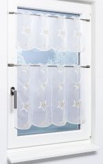 Genießen Sie das harmonische Spiel zweier Farbtöne, die perfekt in ein stimmungsvolles, festliches Ambiente passen. Aus 100 % Polyester entstand hier ein wunderhübsches Wohntextil, eine transparente Scheibengardine, die zart und leicht wirkt, mit ihrem Sternenmuster eine tolle Deko für die Weihnachtszeit ist. Dabei bewegt sich der Sternenschweif schwungvoll über den gesamten Rapport und zeigt in gleichmäßigen Abstanden zwei unterschiedliche Sternenformen, wobei eine davon eine Art Rahmen für die andere bildet. An den feinen Schweiflinien zwischen den Sternen tummeln sich, ebenso wie am oberen und unteren Abschluss, weitere kleine Sterne. Ausladend und prachtvoll endet der Sternenschweif am unteren Abschluss. Mit praktischem Stangendurchzug kann diese Bistrogardine schnell und einfach am Fenster befestigt werden. Sie ist in verschiedenen Höhen und Breiten erhältlich, Spannvitragen, Klemm- und Pinnstangen zum Aufhängen finden Sie ebenso wie Klebehaken und Klemmträger hier im Shop.