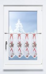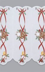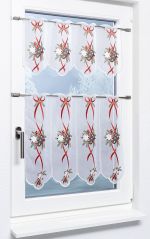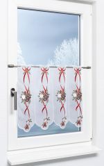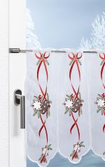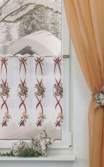 Mit einer mit Tannenzweigen geschmückten Schleife beginnend bewegt sich das rote Band bis hin zum gewellten unteren Abschluss. Die weißen und braunen Lebkuchen, die Orangen und die Tannenzweige mit Beeren sorgen für eine festliche Stimmung. Die typischen Weihnachtsfarben, vor allem das rote Band, heben sich eindrucksvoll von dem weißen Stoff der Scheibengardine ab.