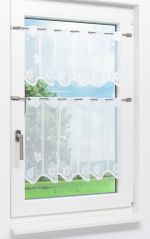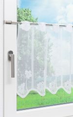 Diese außergewöhnliche Fensterdeko fällt vor allem durch die glitzernden Schmucksteine auf, die jeweils das Innere der Blüten bilden. Ansonsten ist diese transparente Scheibengardine mit einem wellenförmigen Abschluss gestaltet. Dabei ist der Bereich rund um den Stangendurchzug, der zur Aufhängung dient, mit an Wolken erinnernden Gebilden verziert. Der durchscheinende Polyesterstoff lässt blendende Sonnenstrahlen milder wirken und sorgt besonders in kleinen Räumen wie der Küche für eine helle und lichtdurchflutete Atmosphäre.