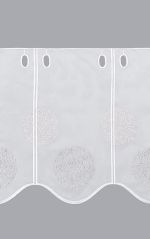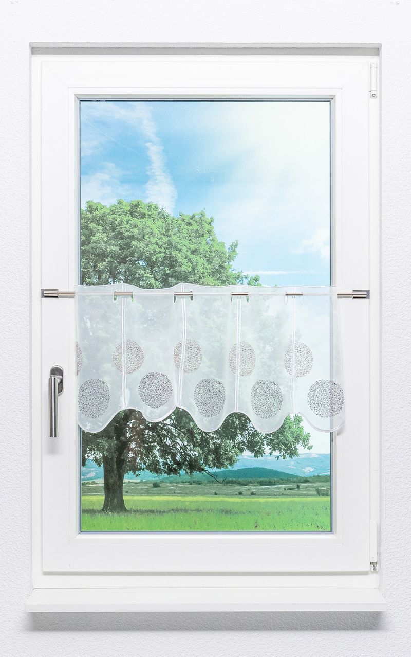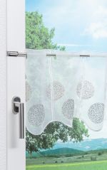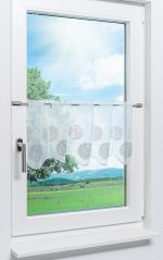 Diese hübsche Scheibengardine aus hauchzartem, fast organza-ähnlichem Polyestergewebe bringt ein natürliches Flair auf eine elegante Art und Weise zum Ausdruck. In unterschiedlichen Höhen und in zwei sich abwechselnden Farben sind runde Kreisformen aufgestickt, die sich aus vielen kurzen Fäden aus schimmerndem Effektgarn zusammensetzen und daher an die Form einer Kugeldistel oder an Zierlauch erinnern können. Die 16 cm breiten Rapporte werden durch zwei schimmernde, gestickte Streifen voneinander abgegrenzt, wobei die schimmernde Umrandung auch den wellenförmigen unteren Abschluss nachzeichnet. Die ovalen Aussparungen am oberen Abschluss dienen der einfachen Aufhängung mit Stangendurchzug an einer Klemm- oder Vitragenstange. Mit dem transparenten Behang am Fenster ändert sich der Lichteinfall kaum, er erfüllt vor allem dekorative Zwecke.