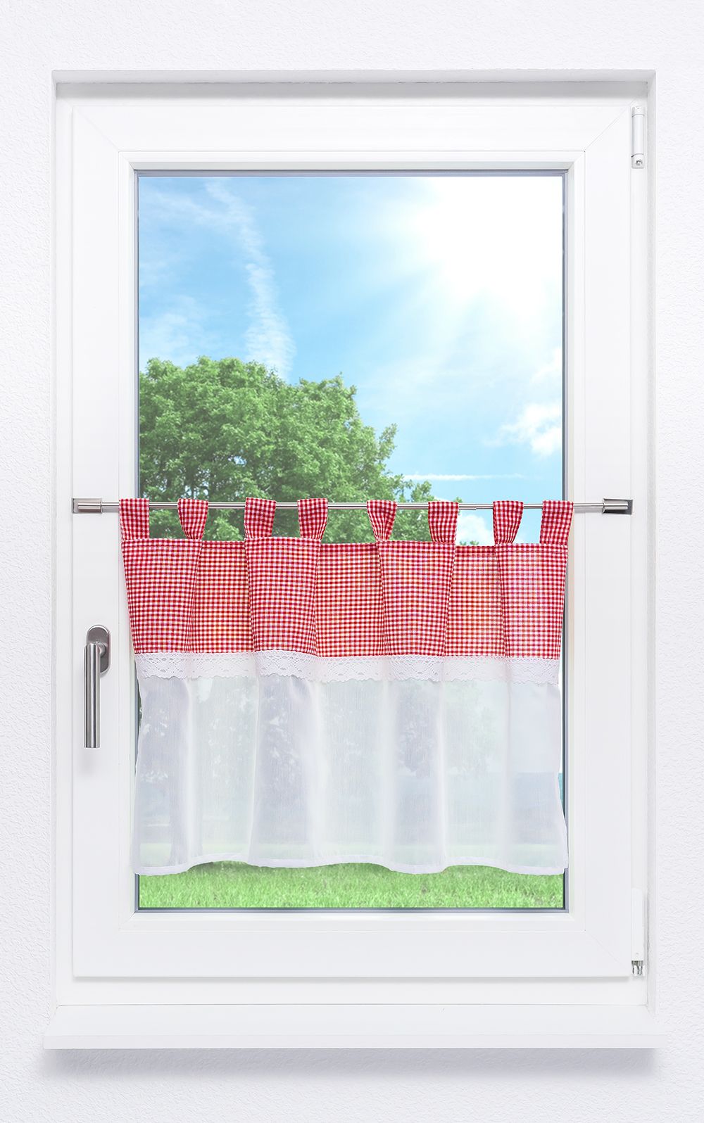 Diese transparente Scheibengardine entspricht mit dem Karomuster und dem Spitzendetail ganz dem Landhausstil. Der obere Bereich ist mitsamt der Schlaufenaufhängung mit einem feinen Karomuster verziert. Den Übergang zum unteren, transparenten Bereich zeigt eine schöne Spitzenbordüre an, die dem Behang eine heimelige und wohnliche Optik verleiht. Der untere Abschluss ist gerade. Dank der Schlaufen lässt sich die Scheibengardine im Nu auf eine Klemmstange oder Vitragenstange aufziehen und ohne Bohren ins Fenster hängen. Durch den transparenten Stoff kommen milde Lichtstrahlen hindurch, das Ambiente bleibt weiterhin hell, offen und freundlich.