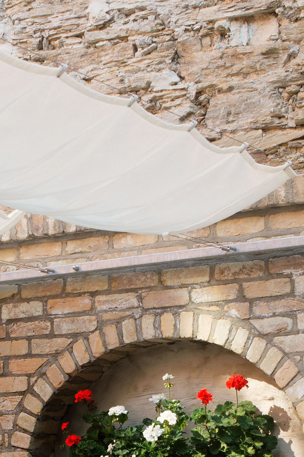 In Weiß erscheint der Stoff einladend und freundlich. Dabei ist das Weiß etwas abgetönt, es wirkt nicht kühl und blendend sondern strahlt eine cremige Wärme aus. Mit einem Sonnensegel in Weiß können Sie Ihrer Kreativität bei der Gestaltung der Terrasse freien Lauf lassen, es lässt sich mit allen Farben kombinieren. Pastelltöne lassen es romantisch und verspielt erscheinen, mit Schwarz- und Grautönen wird es modern. Intensive und knallige Farben kommen durch den Kontrast mit Weiß erst richtig zur Geltung.