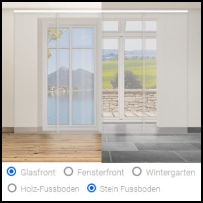 Im Konfigurator können Sie zwischen folgenden Hintergrund-Designs hin und her wechseln: Glasfront, Fensterfront, Wintergarten, Holzfußboden, Steinfußboden