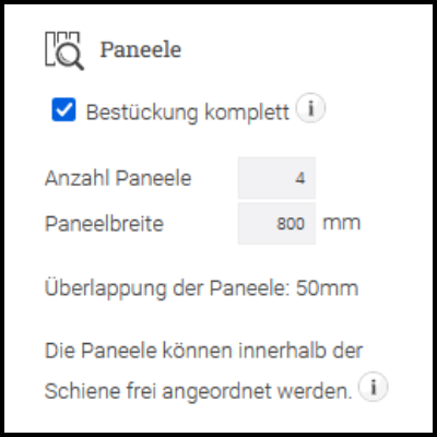 Wählen Sie die Option "Bestückung komplett", um den Flächenvorhang einfacher zu konfigurieren. Der Konfigurator achtet darauf, dass alle Paneele immer die Schiene in der vollen Breite ausfüllen: Gesamt-Paneelbreite (inkl. Überlappung) = Schienenlänge