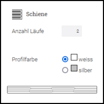 Für die Schiene legen Sie die Anzahl der Läufe und die Profilfarbe fest. In der Sicht von oben auf die Schiene wird in der Animation gezeigt, wie sich die einzelnen Paneele bewegen und auch die Animation oben stellt das Verschieben der Stoffe am Fenster von vorne dar. Nehmen Sie Änderungen im Konfigurator vor, werden diese direkt live übersetzt, deren Auswirkungen sind somit sofort in der Animation sichtbar.