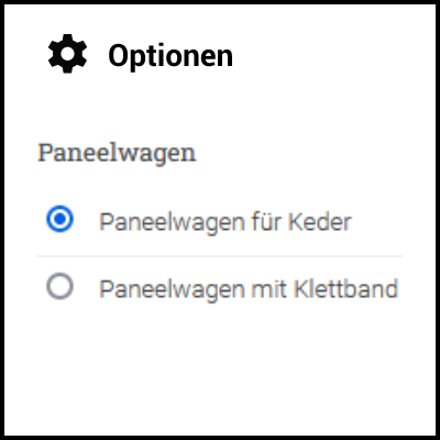 Der Paneelwagen ist als Paneelwagen für Keder sowie als Paneelwagen mit Klettband für Flauschband erhältlich.