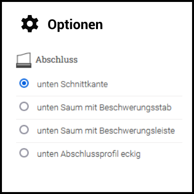 Den unteren Abschluss gestalten Sie als Schnittkante, Saum mit Beschwerungsstab, Saum mit Beschwerungsleiste oder eckiges Abschlussprofil.