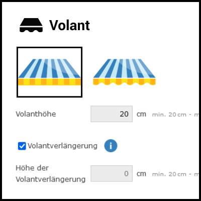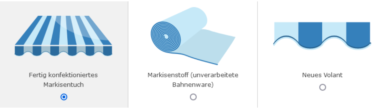 Ob Sie ein Markisentuch nach Maß, einen Markisenstoff als Meterware oder einen (neuen) Volant für Ihr Markisentuch bestellen möchten - nutzen Sie immer unseren 3D-Konfigurator.