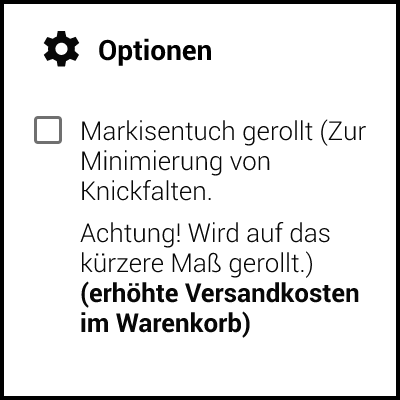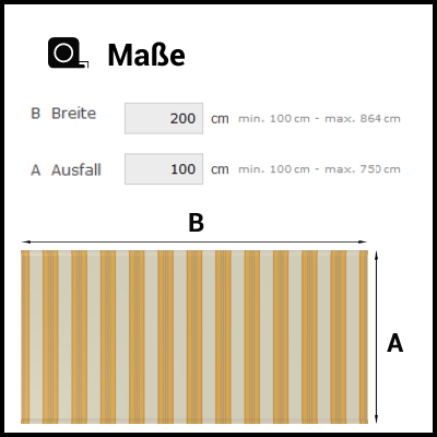 Bei einem Markisentuch als unverarbeitete Bahnenware benötigen wir lediglich den Ausfall des Stoffes. Hier sind Angaben zwischen 100 und 750 cm möglich.