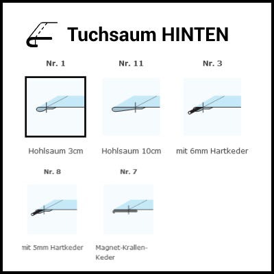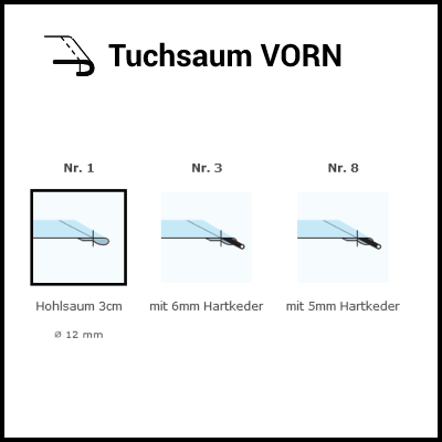 Für einen neuen Volant geben Sie die gewünschte Breite an und legen Sie fest, ob dieser gerade oder gewellt gefertigt werden soll. Zudem benötigen wir die Höhe des gewünschten Volants und optional die Höhe der Volantverlängerung. Den Tuchsaum vorn gestalten Sie als Hohlsaum 3 cm (ø 12 mm) , als 6 mm oder 5 mm Hartkeder.
