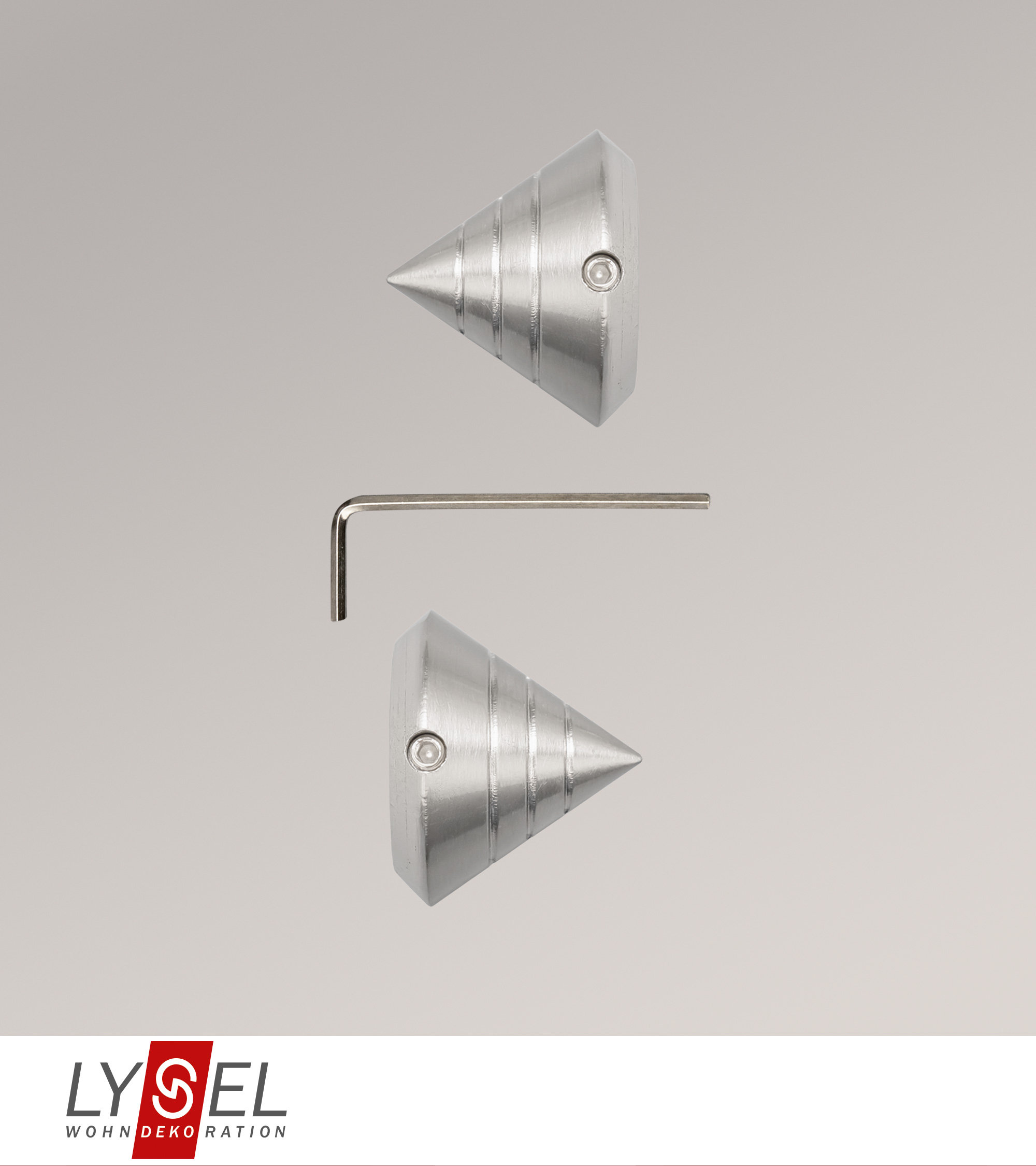 Diese wie ein breiter Kegel geformten Endstücke aus Metall eignen sich für Topaz Gardinenstangen sowie andere Gardinenstangen mit einem Durchmesser von 16 mm. Zusätzlich sind sie mit drei rundherum laufenden Einkerbungen verziert. Die spitz zulaufende und grafische Form verleiht dem Ambiente einen modernen Charakter sowie eine gewisse Lebendigkeit und Dynamik. Mit dem beiliegenden Innensechskantschlüssel werden die Endstücke fixiert. Auf dieselbe Weise können sie wieder entfernt werden.
