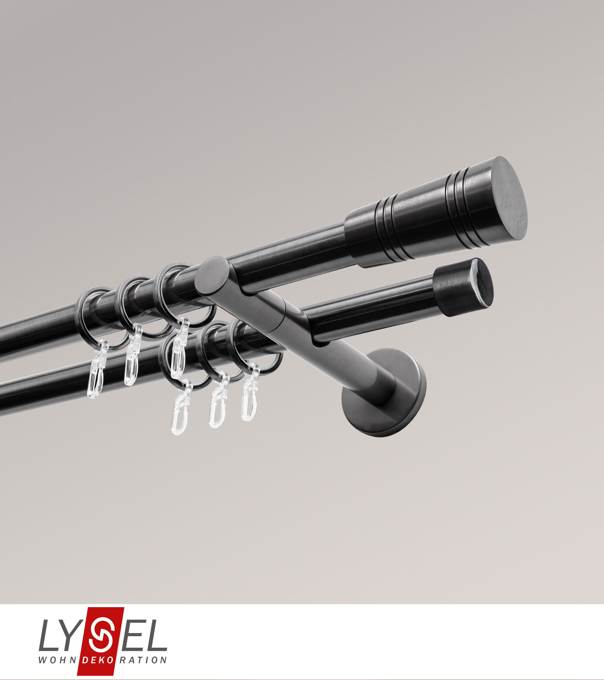 Dieses zweiläufige Gardinenstangen Set mit offenen Trägern beinhaltet neben den runden Gardinenstangen aus glänzendem Metall auch drehbare Doppel-Kombiträger mit Metallmontageplatte und Befestigungsmaterial zum Schrauben, Gardinenringe mit Gleiteinlage sowie zugehörige Gardinenhaken. An die Ringe mit Gleiteinlage werden die Faltenlegehaken geclipst. Anschließend wird die Gardine oder der Vorhang mittels Gardinenband oder Kräuselband an den Faltenhaken befestigt. Die integrierte Gleiteinlage erleichtert die Bedienung und sorgt zudem für ein nahezu geräuschloses Verschieben der Ringe auf der Stange. Hier sind die Endstücke geometrisch und geradlinig, erinnern an einen Kegelstumpf. Zudem sind sie mit rundherum laufenden Einkerbungen verziert, wobei sich jeweils zwei mal drei nebeneinander befinden. Während diese Endstücke mit einem Innensechskantschlüssel befestigt werden, können Sie die gegenüberliegenden Kappen einfach aufstecken. Die stabilen Kombiträger aus Metall besitzen zwei halbrunde Öffnungen und dienen mit drehbarem Außenstück der Befestigung an der Wand. Dabei haben Sie die Möglichkeit die Stangen wahlweise mit der Öffnung nach oben oder unten anzubringen. Die Gardinenstangen werden in die Träger eingelegt und anschließend mit kleinen Schrauben fixiert. Die Kombiträger sind besonders robust und auch für schwere Vorhänge geeignet. Die Gardinenstangen können Sie in verschiedenen Längen bestellen. Abhängig davon sind zusätzlich Verbinder im Lieferumfang enthalten, welche die einzelnen Gardinenstangen zusammenführen und für Stabilität sorgen.
