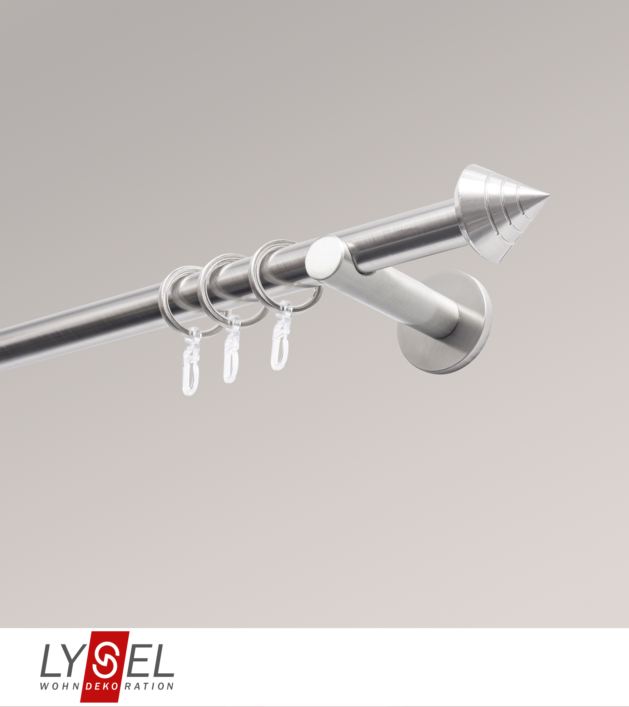 Dieses einläufige Gardinenstangen Set beinhaltet neben der runden Gardinenstange aus glänzendem Metall außerdem die offenen Träger inkl. Befestigungsmaterial für die Schraubmontage an der Wand sowie die kegelförmigen Endstücke, die außerdem mit drei rundherum laufenden Einkerbungen versehen sind. Mit einem Innensechskantschlüssel werden sie fixiert. Der stabile Wandträger mit Metallmontageplatte hat eine halbrunde Öffnung, in welche die Gardinenstange eingelegt und mit kleinen Schrauben fixiert wird. Sie können sie in verschiedenen Längen bestellen. Abhängig davon sind im Lieferumfang zusätzlich Verbinder enthalten, welche die einzelnen Gardinenstangen zusammenführen und für Stabilität sorgen. Fädeln Sie die Gardinenringe mit Gleiteinlage und Faltenlegehaken auf die Gardinenstange auf; anschließend wird die Gardine oder der Vorhang mittels Gardinenband oder Kräuselband an den Faltenhaken befestigt. Die integrierte Gleiteinlage erleichtert die Bedienung und sorgt zudem für ein nahezu geräuschloses Verschieben der Ringe auf der Stange.